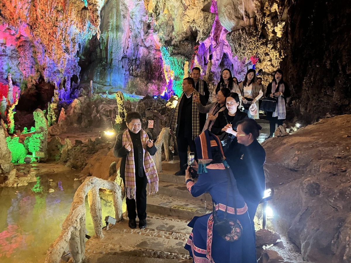 吉星岩贯穿五座山峰,洞内千余处天然景观涵盖石笋、石幔、钙华池等形态,“神象赐福”“天下第一钟”等造型惟妙惟肖。“是不是特别像《西游记》里的龙宫?”广西海外文旅联合会办公室主任陆东钰是土生土长的德保姑娘,此次参访回到家乡,她主动客串向导,兴奋地向同行嘉宾推介家乡美景。岩洞内巧妙融合现代声光电技术打造的“水上莲花”“天上人间”等场景,让参访团代表流连忘返。
